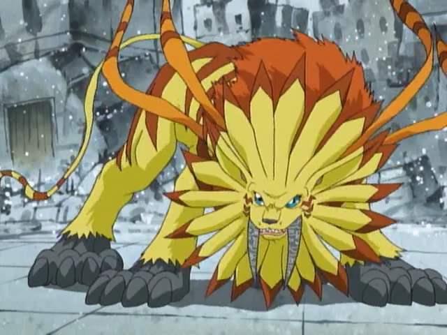 狮子兽进化体,拥有超高爆发力,没有任何宝贝可以躲避这种速度的攻击,两颗长长的獠牙加上硕大的爪子,能够摧枯拉朽的摧毁一切邪恶力量。必杀技毛体硬质化并炸向敌方的爆裂飞箭。毛含毒,对受到攻击的敌方会有麻痹效果。其杀手锏粉碎之爪可以打碎任何坚硬的物体。最终在与钢铁猩猩兽战斗过程中,为了保护被选召的孩子们被钢铁猩猩兽的死亡霹雳剑击中,领了盒饭。