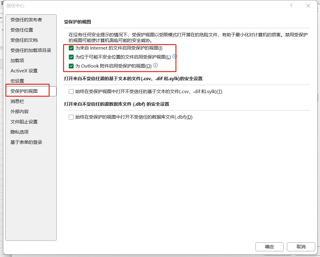 第三步 进入后点击受保护的视图,将右侧三项取消打钩确定即可