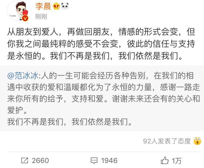 李晨转发范冰冰微博,从朋友到爱人,再做回朋友,情感的形式会变,但你我之间最纯粹的感受不会变,彼此的信任与支持是永恒的。我们不再是我们,我们依然是我们。