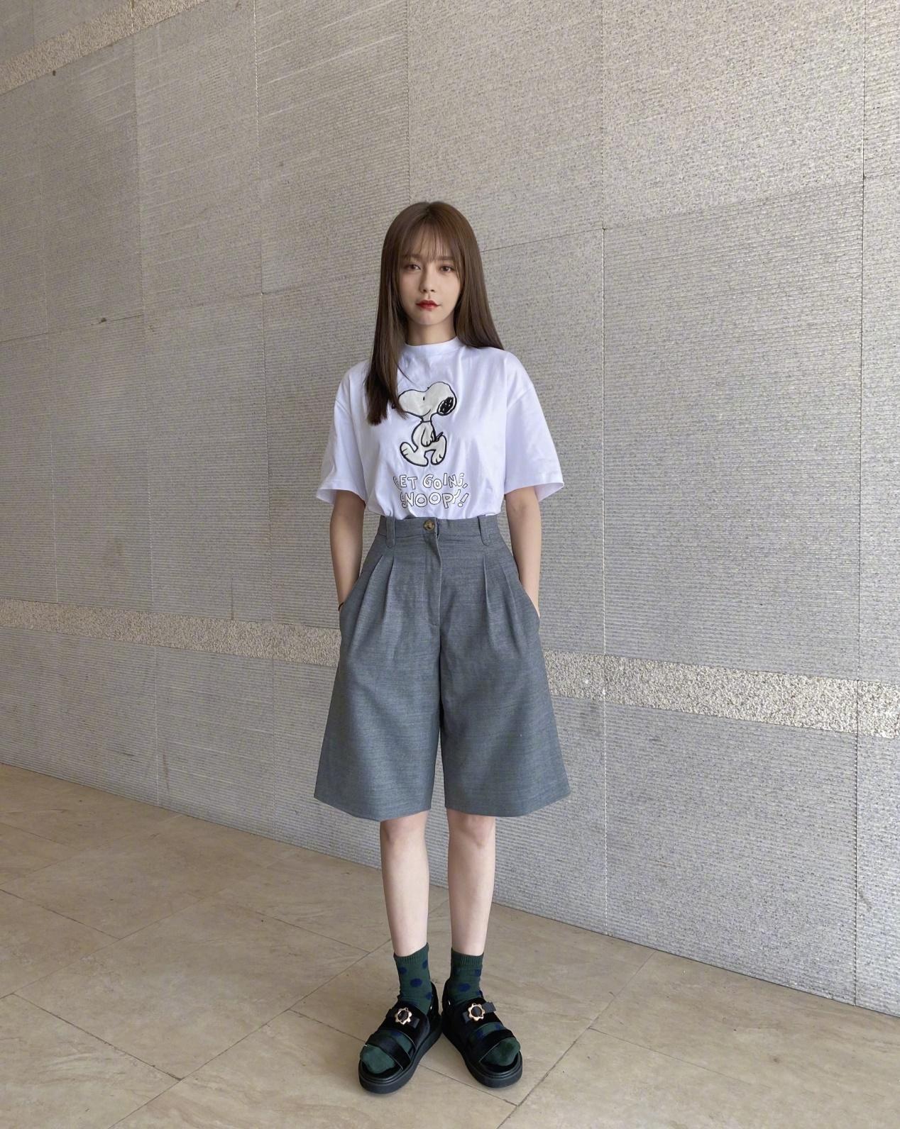 除了旅游时候的穿搭,沈梦辰的日常穿搭也是非常值得借鉴的。她穿了一件白色的T恤,T恤的圆领设计修饰了沈梦辰的脖子曲线。白色T恤上印花图案的点缀显得整个衣服的色点鲜明了起来,增添了些许活泼的气息。下半身是一条灰色的五分裤,版型宽松,不仅使人感到清爽舒适,还可以起到遮肉修身的效果。