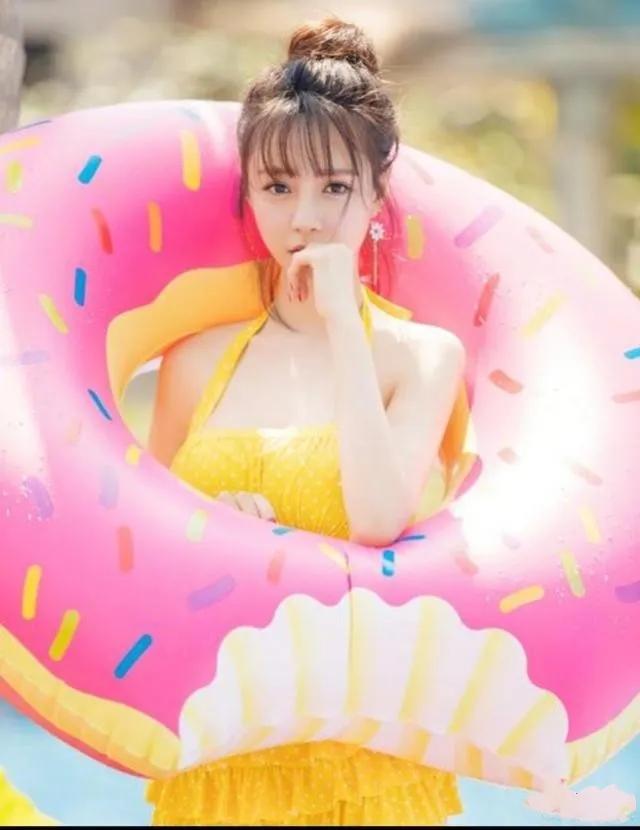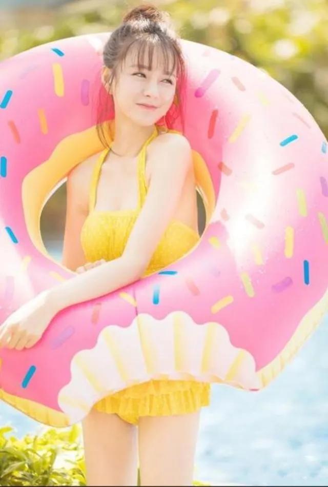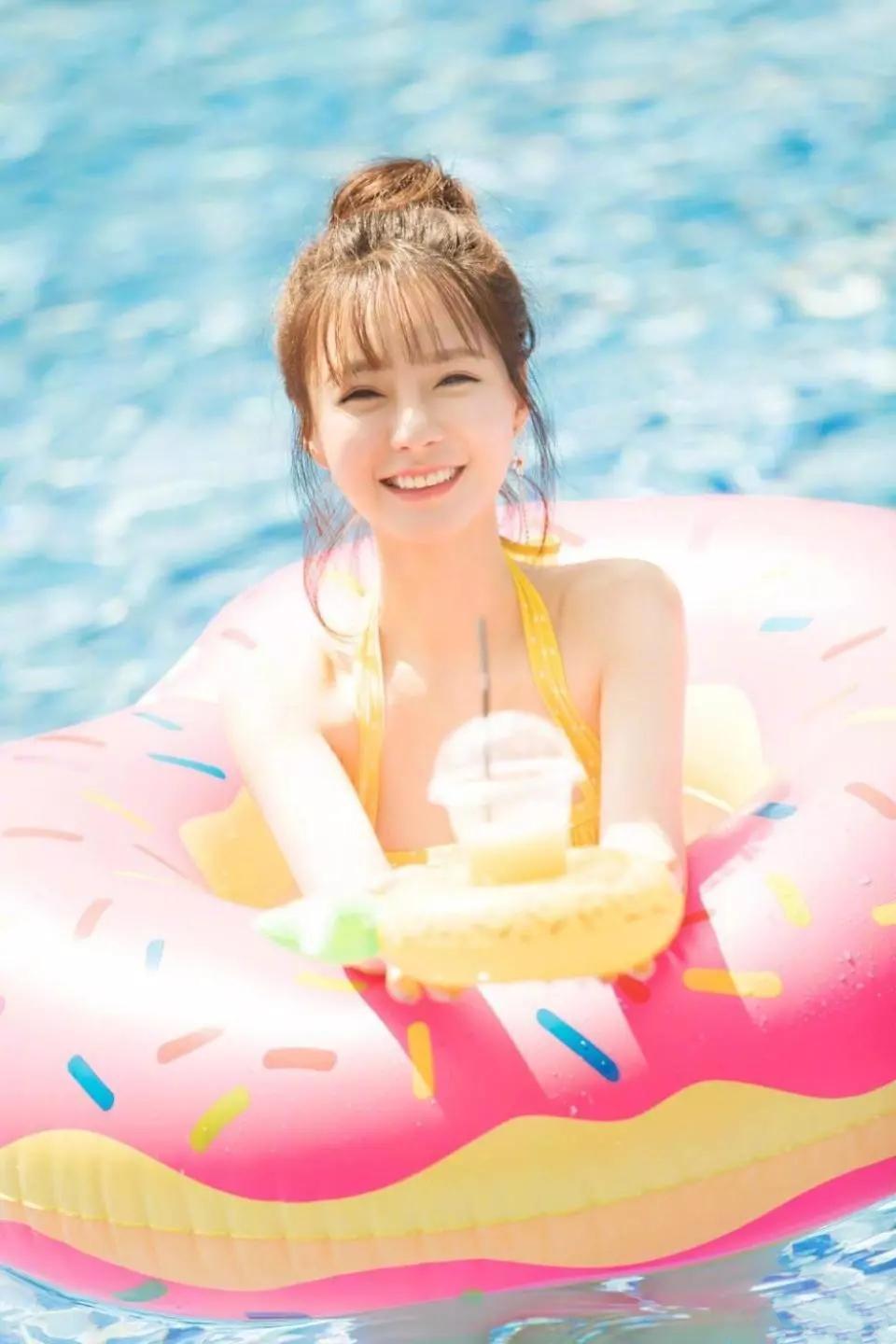 比基尼看起来十分的修身很好的凸显出她的胸部曲线,使整个人看起来肤白貌美腿部修长。她手中环抱的游泳圈以鲜明的粉红色为主,上面各色的点缀,看起来有种浪漫满屋的感觉。再加上她皮肤白嫩,游泳圈的环绕更显得整个人娇小玲珑。她的造型也是十分的可爱,额头的空气刘海,精心装扮的丸子头,让人觉得有一种恣意洒脱感觉。