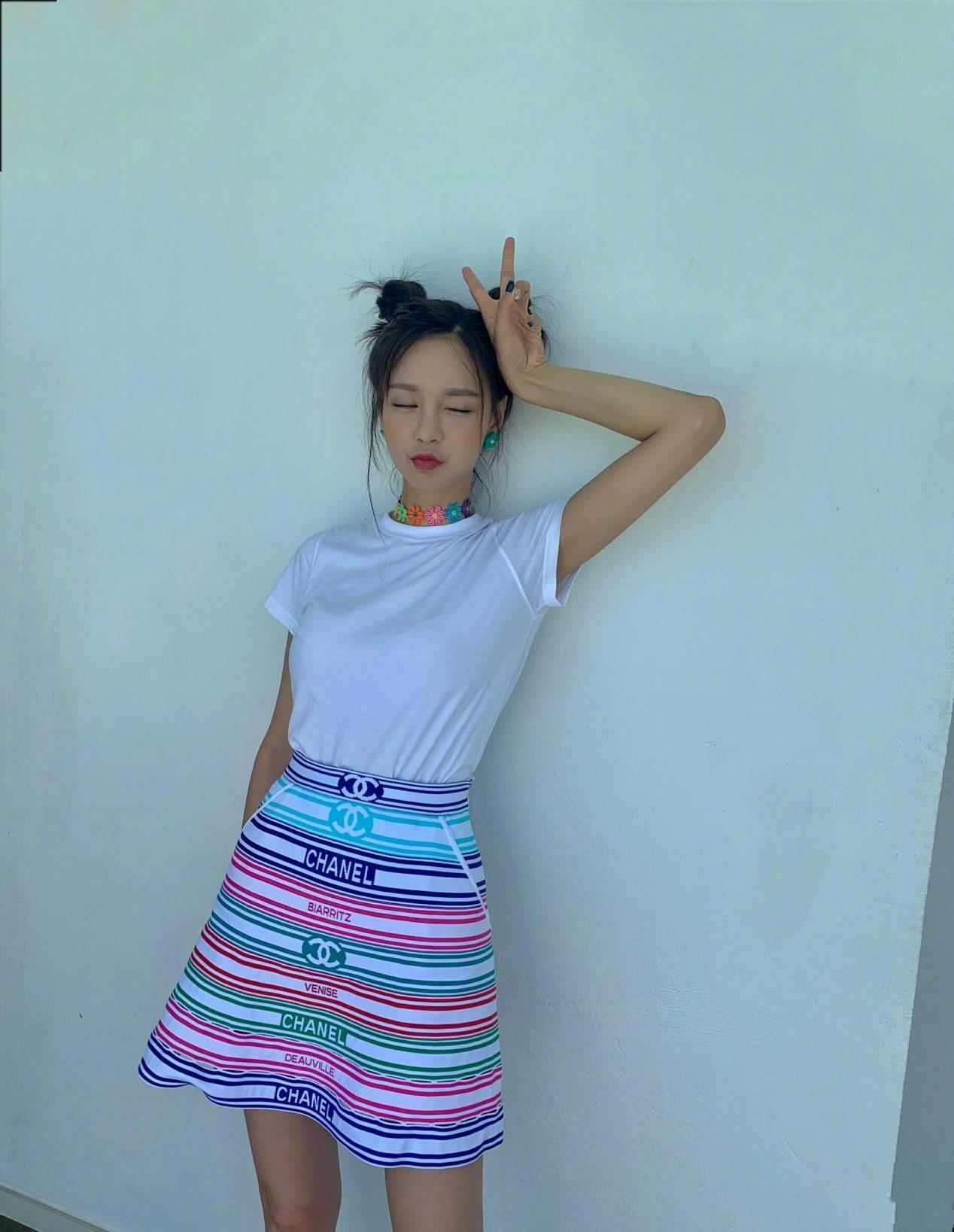 沈梦辰的这一套沙滩造型也是十分的抢眼的。她上身选择的是一件纯白色的T血衫,修身有形,把她的纤纤细腰展露出来。下面搭配彩色条纹的半身裙,彩色条纹看起来亮点鲜明,协调了上身纯白带来的单调,给人的视觉带来更加强烈的冲击。半身裙短款精巧的设计,使腿部看起来更加纤细,也使整体着装更加的清爽明媚。