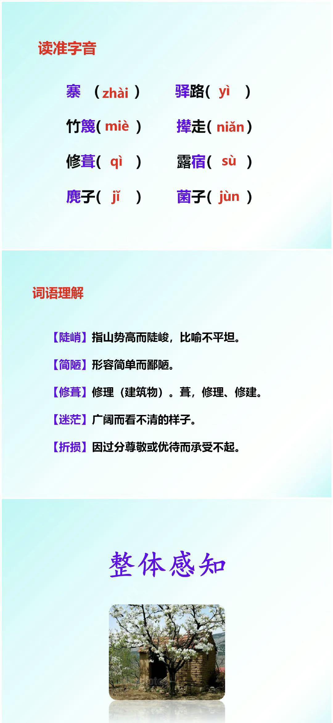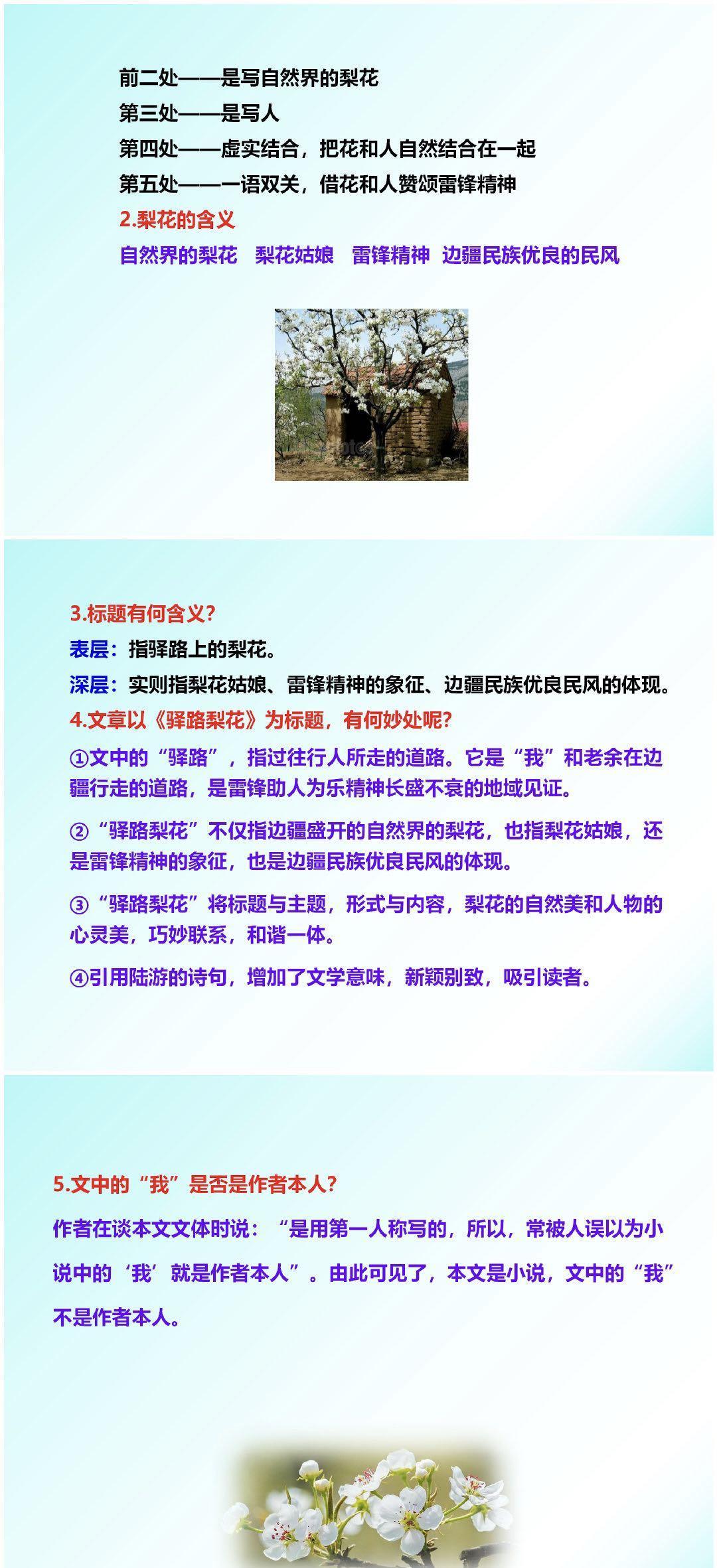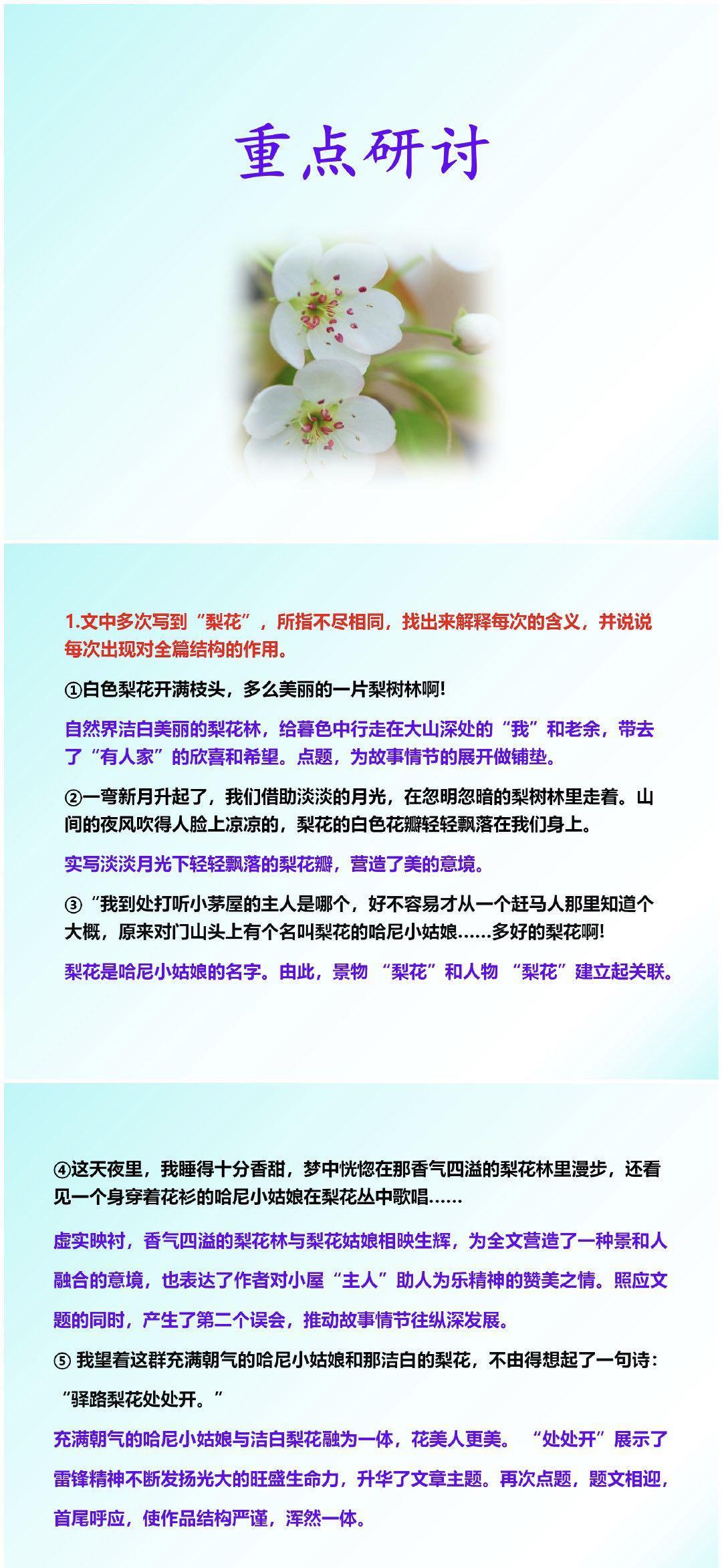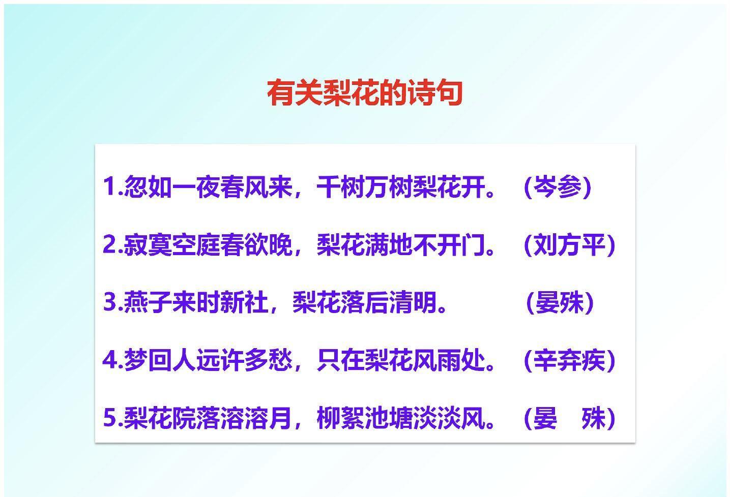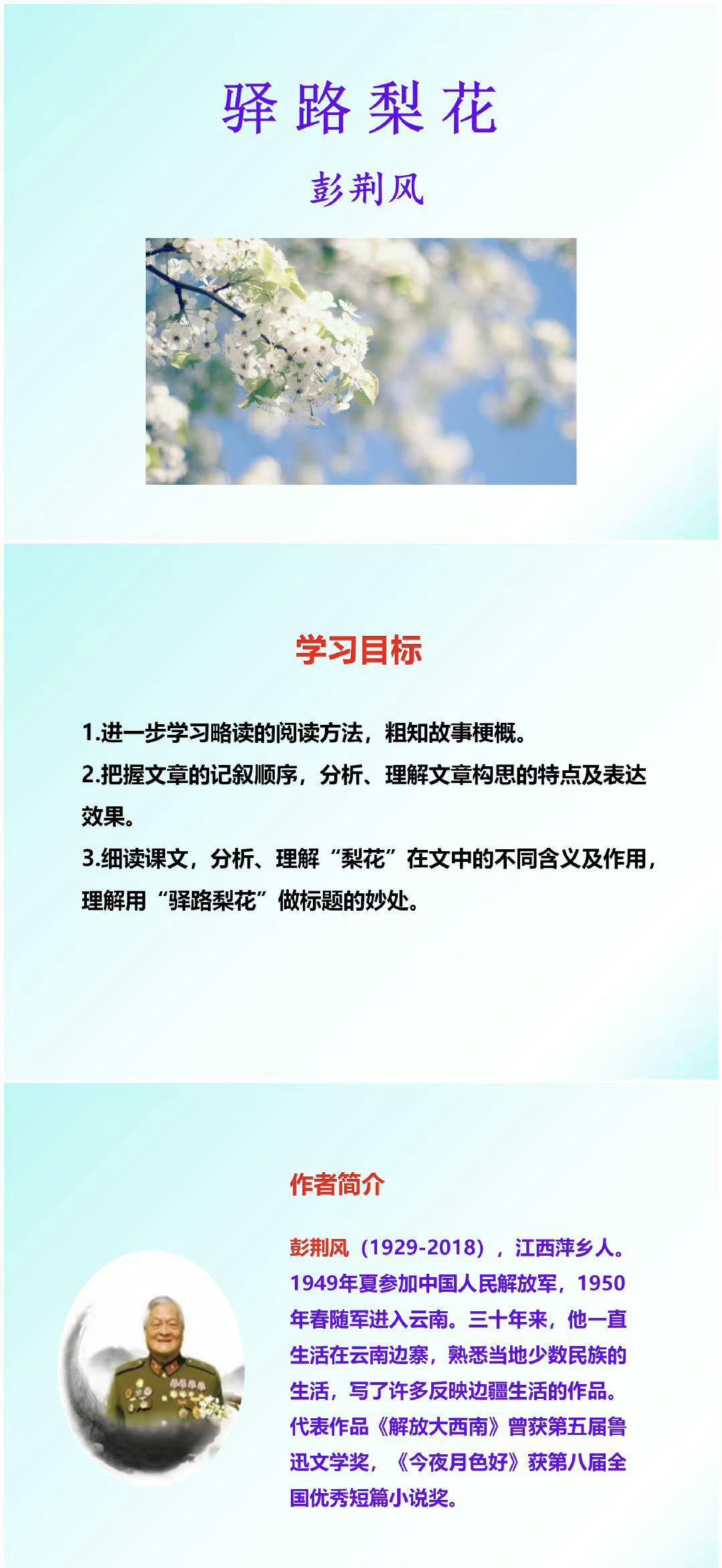 [给你小心心]接下来,即将开启的内容有:学习目标;作者简介;写作背景;哈尼族;文体知识;读准字音;词语理解;整体感知;合作探究的余下内容;重点研讨;写作借鉴;主旨归纳;板书设计;有关梨花的诗句,这些内容,会以下面的“图文并茂”形式,一一进行直观、具体的讲解。请各位朋友耐心阅读、赏析!