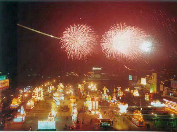 早年正月十五在电影院那里的灯会,小时候的照片很多背景都是这样的花灯。还有烟花。
