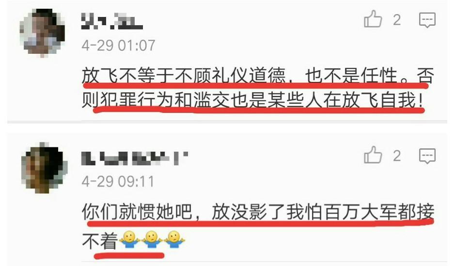 不过,对于她开通这样一个话题,有网友存在着担心,鉴于之前的放飞行为要么是和网友互怼,和媒体互怼,要么是和网友爆粗口谩骂,如今开通这样一个“放飞自我”的话题,不知道会不会走引起不必要的麻烦。所以就又网友提出,“放飞不等于不顾礼道德,也不是任性。”