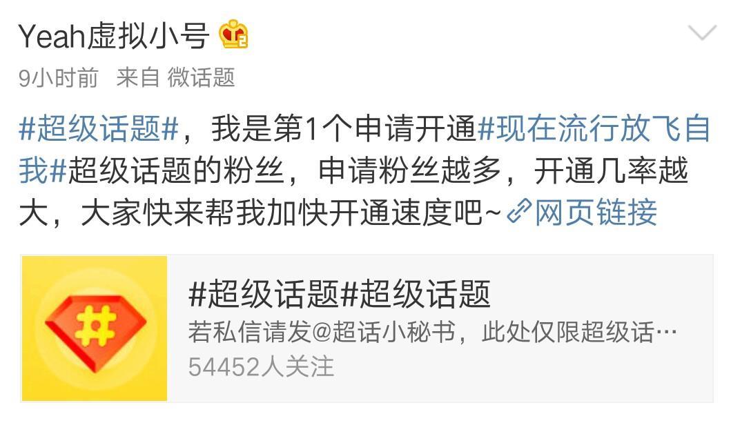 今日凌晨,郑爽申请了一个超级话题,名字叫“现在流行放飞自我”,还是第一个申请该超级话题的人,随后,就有近千万人加入申请。不知道是不是昨日的这一波热搜让一直在放飞路上的郑爽想到要开这样一个超话。超话一开通就得到粉丝的积极响应。
