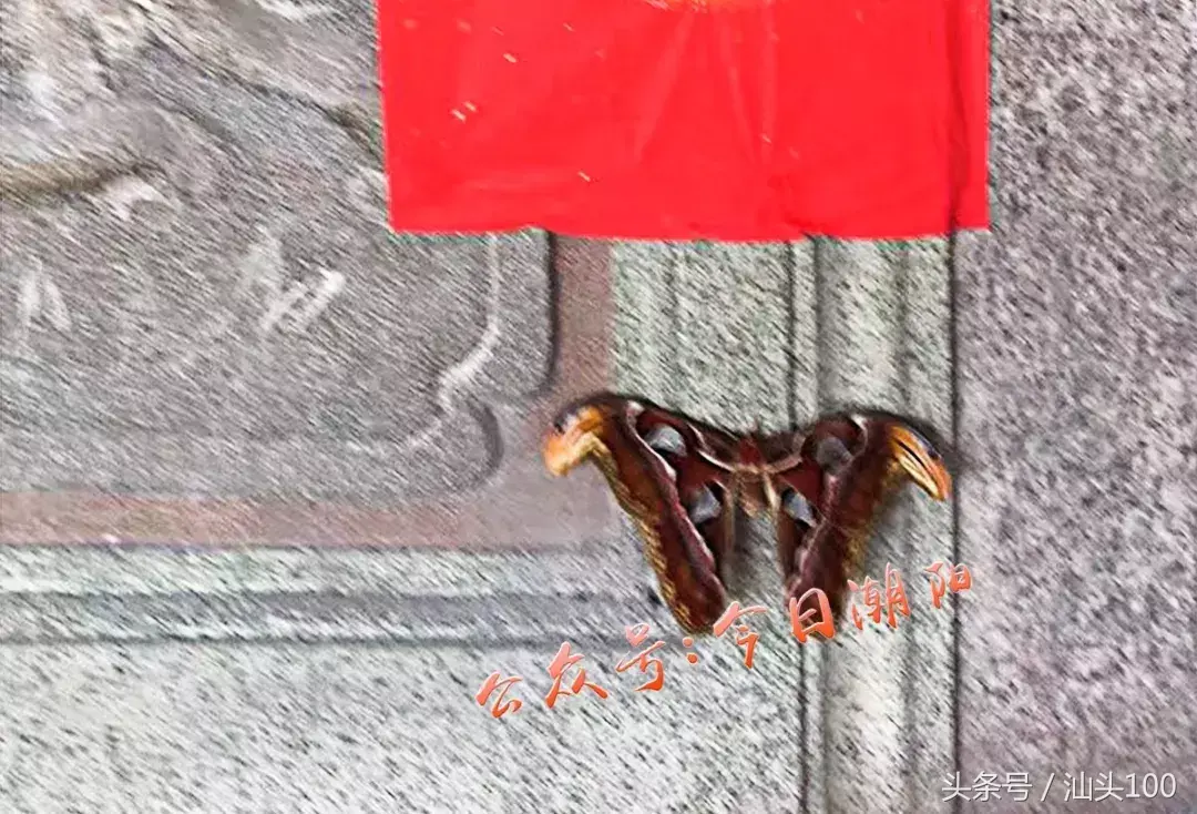 网友报料:今天,潮阳金灶镇一户人家的女儿订婚,便到村里古庙答谢神恩。不巧的是,在古庙门口发现一只体形“巨大”、造型奇特的蝴蝶。