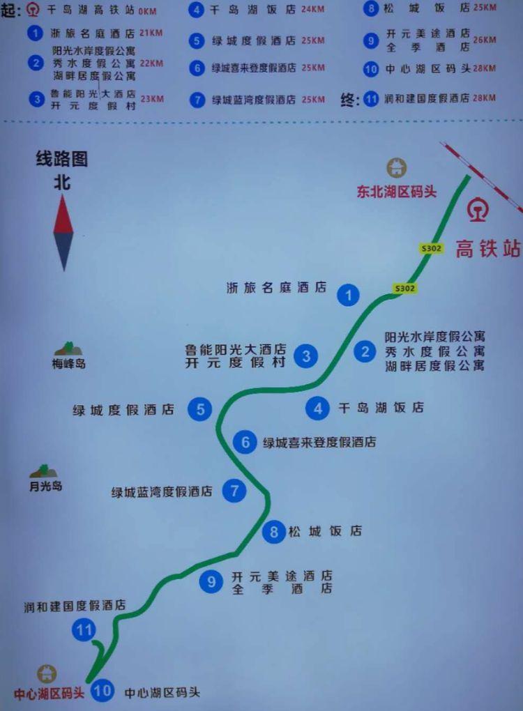 001路车线路全程28公里:千岛湖站—浙旅名庭—阳光水岸—开业度假村—千岛湖饭店—绿城度假酒店—喜来登酒店—松城饭店—全季酒店—润和建国酒店—中心湖区旅游码头;