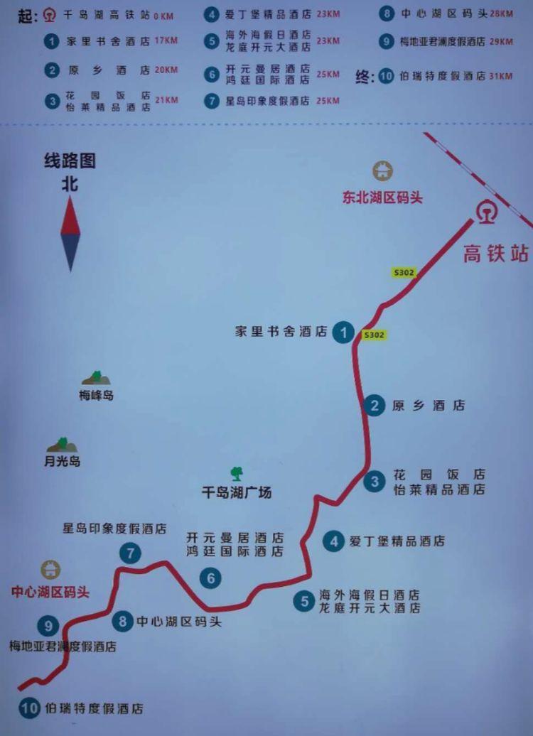 002路车线路全程31公里:千岛湖站—原乡酒店—花园饭店—爱丁堡酒店—海外海假日酒店—开元曼居酒店—星岛度假酒店—中心湖区旅游码头—梅地亚君澜酒店—伯瑞特酒店。