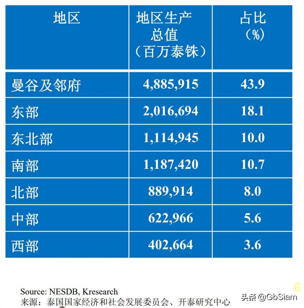 而泰国经济的区域分布,则40%的国内生产总值由大曼谷区贡献。中部及西部是泰国人口较少经济较为落后的地区(两个区域GDP贡献占比少于10%)。