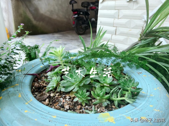 我们吃饭的这家,小小的院子里种满了绿植。物尽其用,用轮胎做花盆,撒上种子,待植物生长时,给小院增添了一景。
