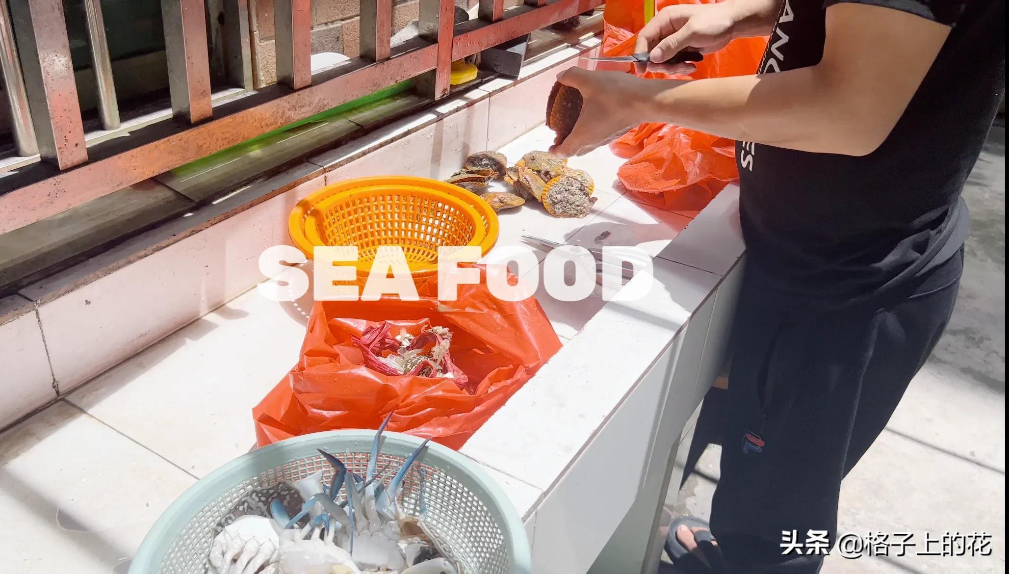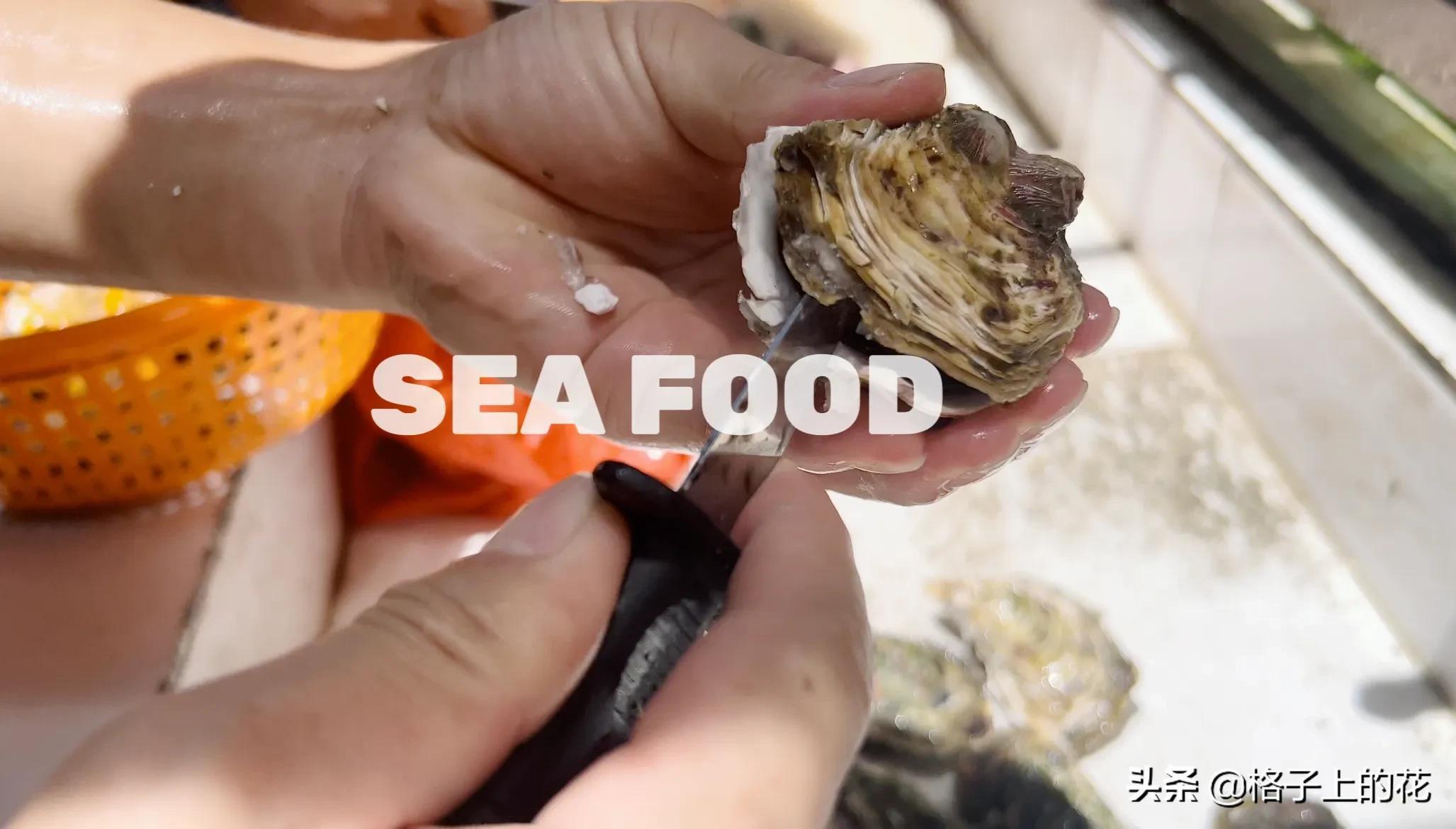 老板和开船大哥,一起开生蚝、撬扇贝,全程见证他们做美食的工序。