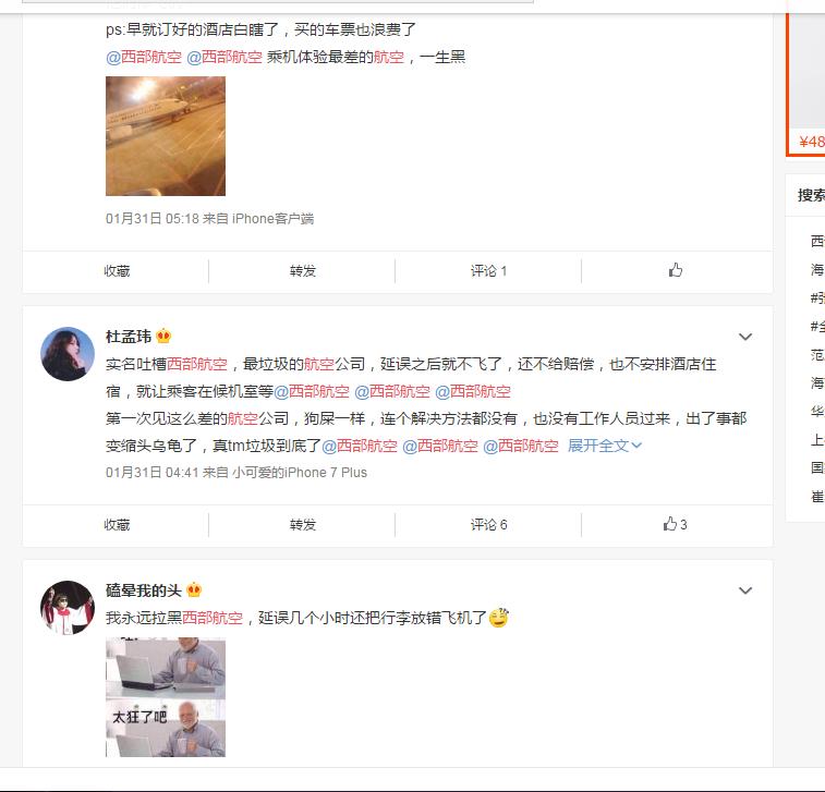网友吐槽西湖航空延误不赔付、无飞机餐,等等。