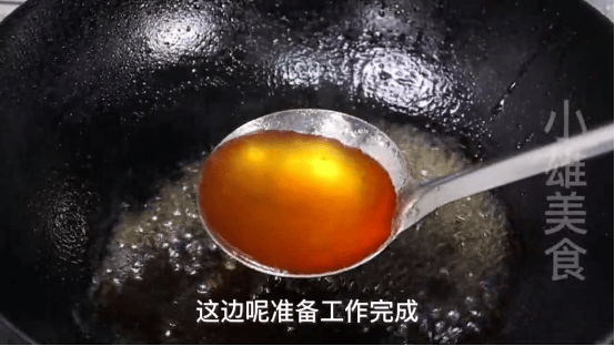 5、接着我们要提前熬上一些糖水,起锅烧油,下入一小把白冰糖,用小火慢慢地将白糖炒到融化,直到颜色从一开始的香油色变成枣红色,不停冒小泡泡时。