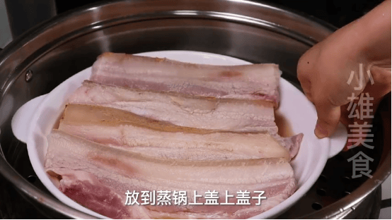 2、将五花肉清洗两遍以后,直接装到盘子里面,再往五花肉里淋上一大勺料酒,放到蒸锅当中,盖上盖子,开启中火蒸上三十分钟左右。