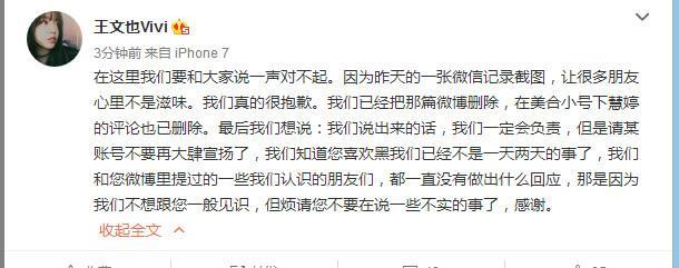 王文也在11月3日下午在微博发文致歉称会对她们说过的话负责。