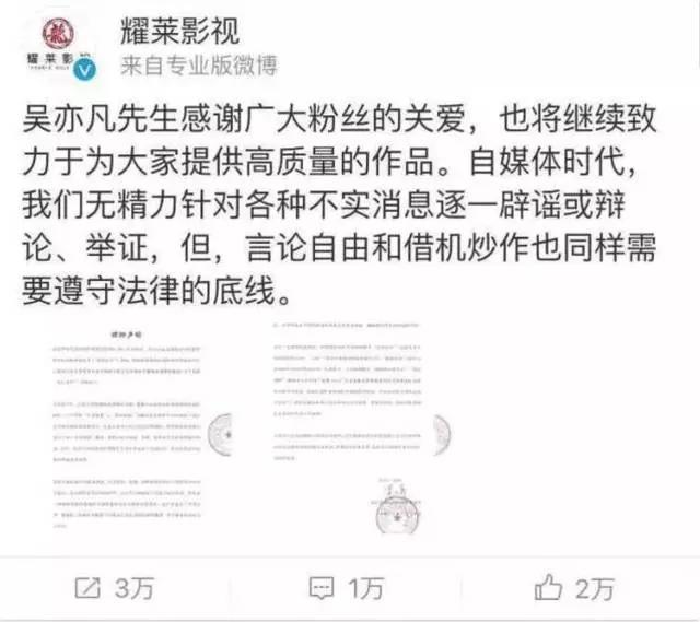 綦美合对于吴亦凡也是非常的喜爱,当年吴亦凡闹出“全球交友事件“的时候,各种塌人设各种掉粉,粉丝们只能在微博上打假找锤刷热搜的时候,耀莱影视的微博账号发了一条“凡人耀莱”的微博,并为吴亦凡发表了法律声明。