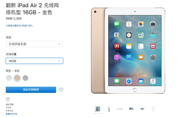 2月7日,苹果官网悄然上架翻新iPad Air 2,16GB版售价2368元,64GB版售价2788元,128GB版售价3128元。