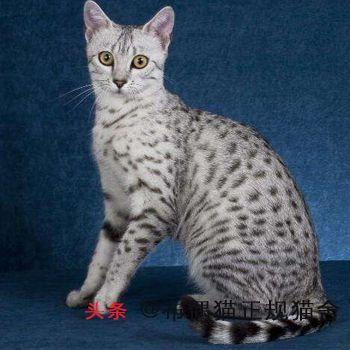 埃及猫皮肤和毛色上都有像豹的斑纹,埃及猫形体适中,肌肉发达。埃及猫是点状虎斑种的猫中唯一不以人工繁殖,而是自然形成点状花纹的猫种,被誉为“小型豹”,身上的点状花纹、或大或小随意分布,脸、四肢和尾巴有条纹图案。额头的眉宇之间有一个圣甲虫图案。