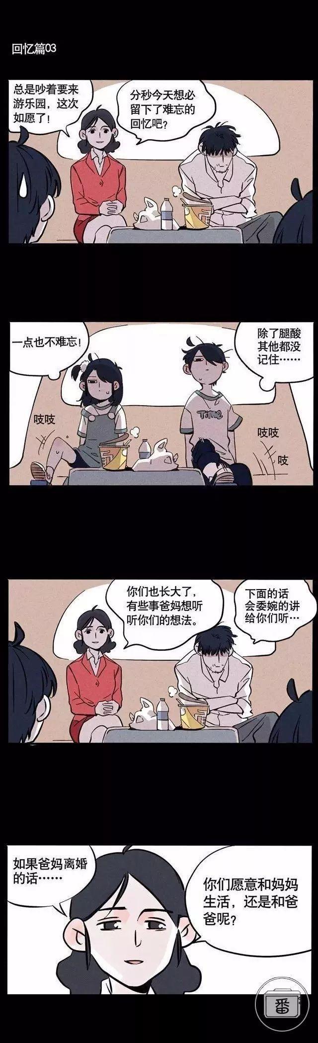 这里,动画上没有说,不过漫画上回忆篇里有介绍:父母天天吵架。终于在一次一家四口在游乐园里玩过之后,父母很郑重的问他们,如果父母离婚,他们愿意跟谁。