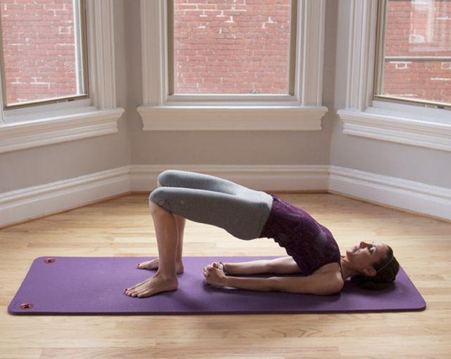仰卧,双脚分开与髋同宽。用力按下双脚,然后将臀部抬离地面。双手相扣在一起,然后将拳头向下按到地板上,这样可以进一步打开胸腔。保持8-10次呼吸,然后放低臀部,再重复两次。