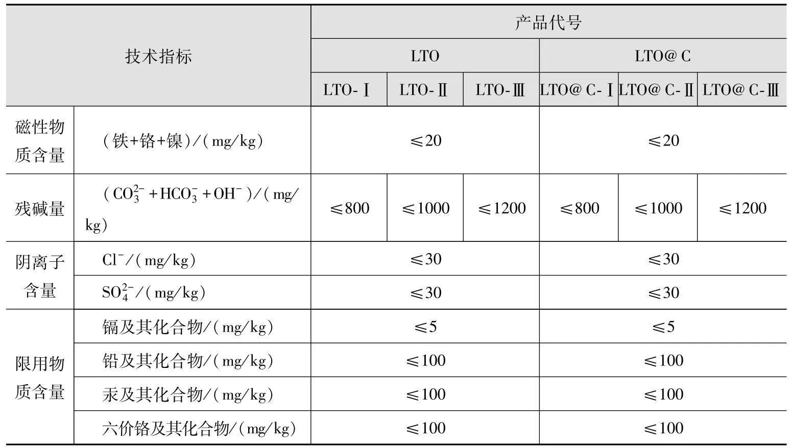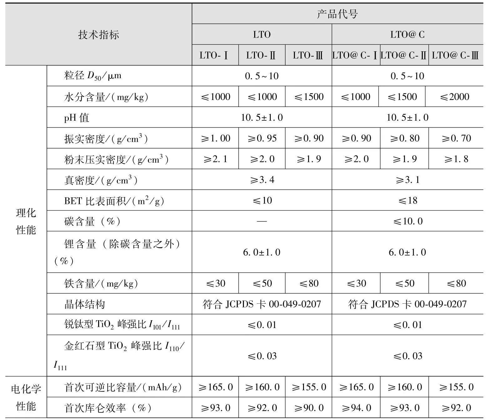 2014年,钛酸锂材料行业国家标准GB/T 30836—2014《锂离子电池用钛酸锂及其炭复合负极材料》发布,在标准中,规定了不含碳的钛酸锂负极材料LTO和炭复合钛酸锂负极材料LTO@C的理化性能、电化学性能、磁性物质含量、残碱量、阴离子含量以及限用物质含量等相关的技术指标。不含碳的钛酸锂负极材料LTO分为三个类别,分别用LTO-Ⅰ、LTO-Ⅱ、LTO-Ⅲ表示,炭复合钛酸锂负极材料LTO@C分为三个类别,分别用LTO@C-Ⅰ、LTO@C-Ⅱ、LTO@C-Ⅲ表示,具体技术要求见表1。