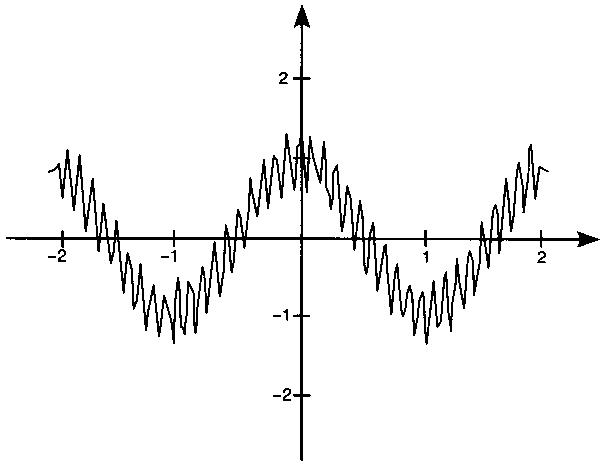 的图形。这个图形显示出大量的方向改变以及某种急剧上升和下降的特性,但是没有尖角。事实上,魏尔斯特拉斯函数的任何部分和只包含有限的余弦项,因而是处处可微的。无论画出哪个部分和的图形,我们都不能从中找到一个角点。然而,当我转向求极限产生f本身时,必定处处出现角点。魏尔斯特拉斯函数超出我们直觉所能理解的范围,是远非可以用几何图形画在黑板上的。但是从上面的证明看出,它的存在是毋庸置疑的。