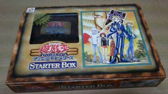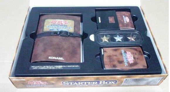 《STARTER BOX》1999年3月18日发售,属于上个世纪的珍品。这个盒子有着一个体积堪比决斗盘的大包装盒,里面装的东西则不多:50张卡、带支架的盒子、计分板、规则手册、计算器、规则说明书、决斗场、6个塑料星片(1个金色、2个银色、3个铜色)和装星片的小盒。当时售价3480日元。现在的售价,呵呵。