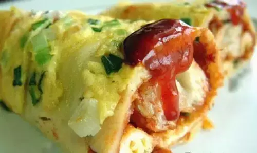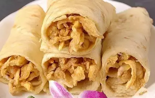 天津早点可不仅仅只有煎饼果子,大饼鸡蛋更是相当受欢迎。大饼鸡蛋又称大饼卷鸡蛋,是一种天津风味街头小吃。