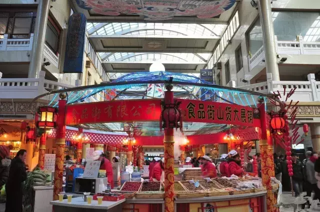 食品街是一座仿清式古建筑,采用民族建筑风格,外古典内现代。外观造型雕梁画栋,街内装修金壁辉煌。入夜霓虹灯闪烁,更显迷人。