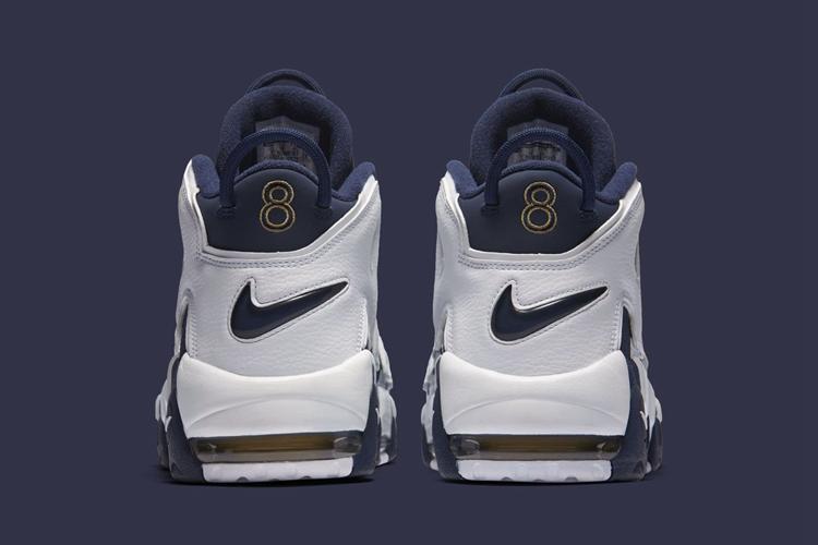 这双Nike Air More Uptempo 奥运会配色的鞋身部分以海军蓝为基础色调,这也与当年美国梦之队的队服的色调一致。