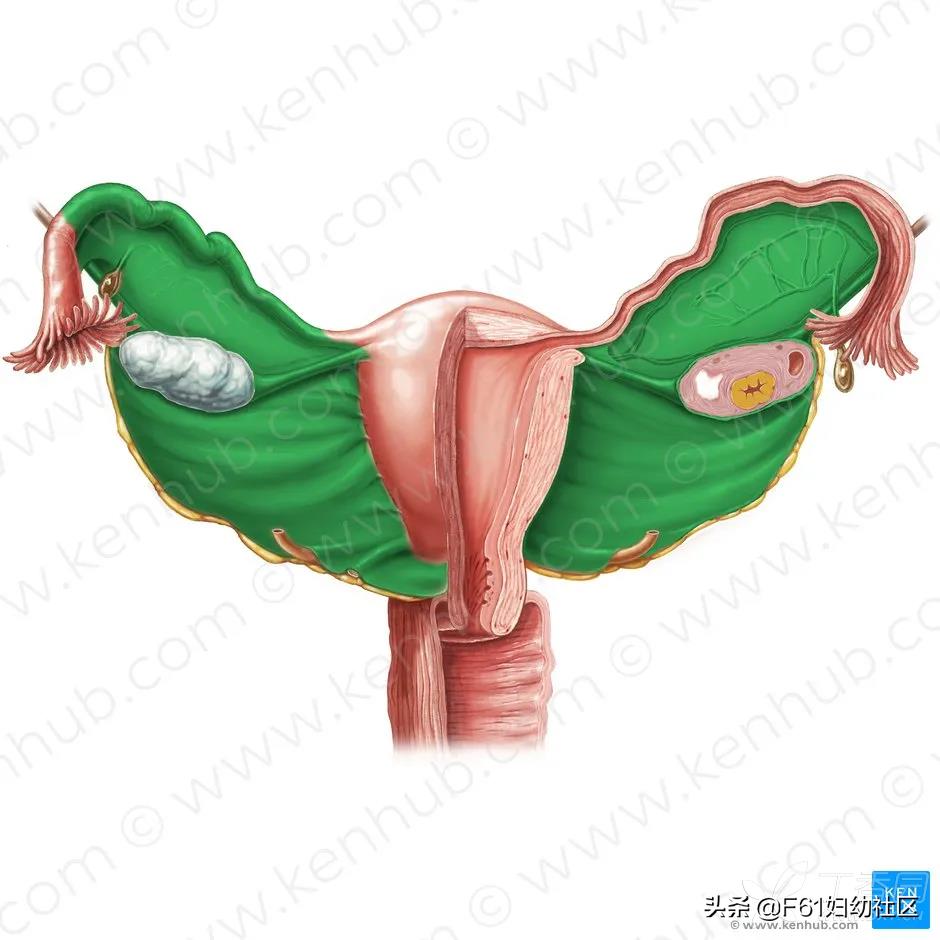卵巢系膜——卵巢系膜是从阔韧带向后面突出的腹膜皱襞,是阔韧带中较小的部分。此系膜附着到有血管和神经出入的卵巢门。