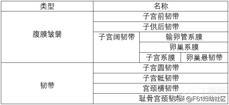 子宫韧带分为腹膜皱襞及韧带,腹膜皱襞组成由子宫前韧带、子宫后韧带、子宫阔韧带组成,子宫阔韧带由输卵管系膜、卵巢系膜、子宫系膜、卵巢悬韧带组成。子宫韧带类型分为子宫圆韧带、子宫骶韧带、宫颈横韧带、耻骨宫颈韧带。
