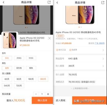 例如价值7099元的苹果XS(金色)为例,加油宝标价为7099元,在期限为360天的情况下,用户想要“白拿”需要充值84100元,收益为零。若期限为60天,则需要存入62.4万元才可拿到一部7000元的苹果手机。