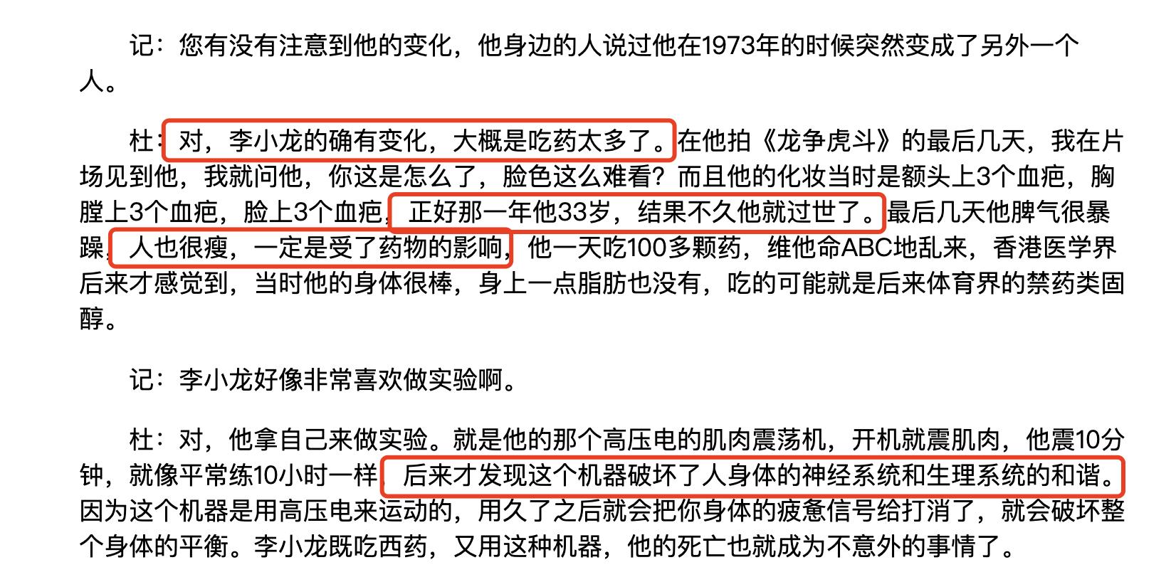 该记者还爆料称:“最后几天,李小龙脾气很暴躁,人也很瘦,一定是受了药物的影响,他一天吃100多颗药!”