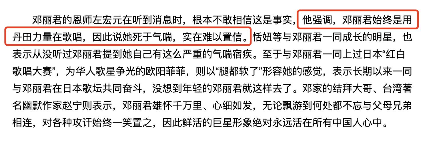 邓丽君的恩师左宏元,在听到该条消息时,根本不敢相信这是事实,他一再向媒体强调:“邓丽君始终是用丹田力量在歌唱,都说她死于气喘,实在令人难以置信。”