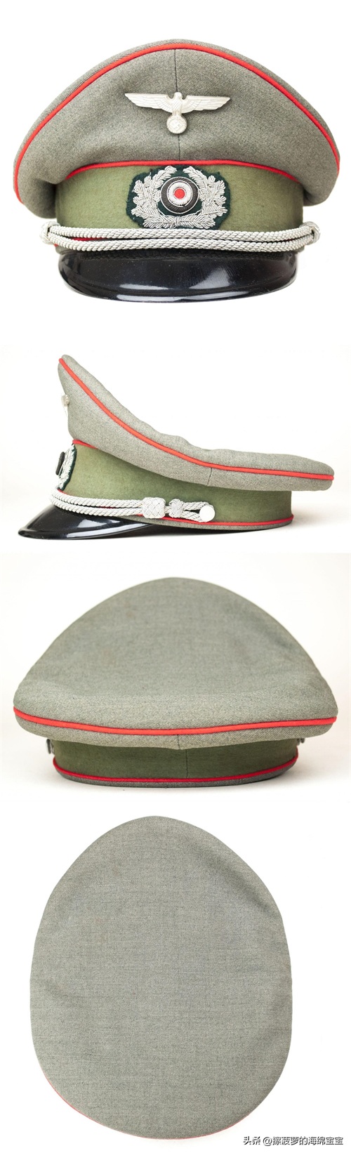这款军官大檐帽的帽徽和鹰徽都是布质刺绣,用的华达呢制成,帽顶边缘和帽墙上下还有白色滚边色,代表步兵。