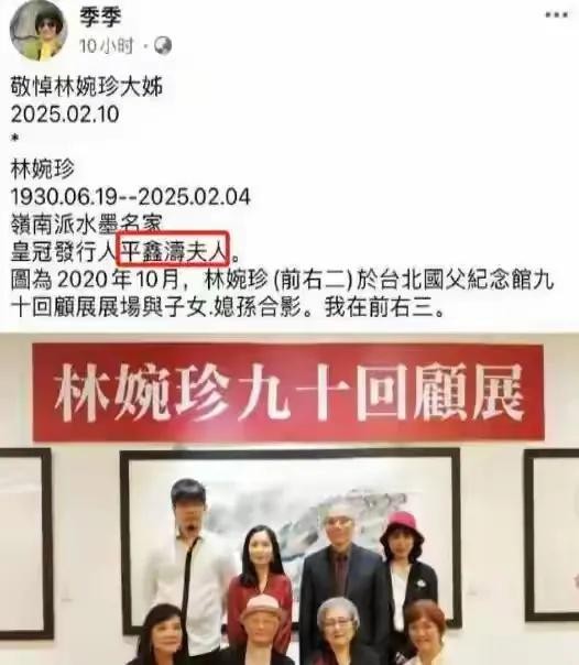 林婉珍去世后,她妹妹干了一件事,又把这场风波闹得更大了。她妹妹在发文悼念林婉珍的时候,竟然还叫林婉珍“平鑫涛夫人”。要知道,林婉珍和平鑫涛离婚都已经好长时间了,后来还嫁给别人,开始了新生活。她妹妹这么一叫,网友们瞬间炸开了锅,都在猜测她到底是什么意思。难道是想告诉大家,林婉珍这一辈子最爱的还是平鑫涛吗?可这明显就是在挑衅琼瑶家人的底线啊,毕竟琼瑶后来和平鑫涛结婚了。而且不光是她妹妹,林婉珍的子女在说林婉珍去世细节的时候,也被大家觉得是在故意和琼瑶作对比。他们一直强调林婉珍走得很安详,可琼瑶是自杀的呀,这么一对比,真的让人心里特别不是滋味。不过还好琼瑶的儿子和儿媳很大度,没被这些事影响,真的做到了尊重死者,没有跟他们计较。