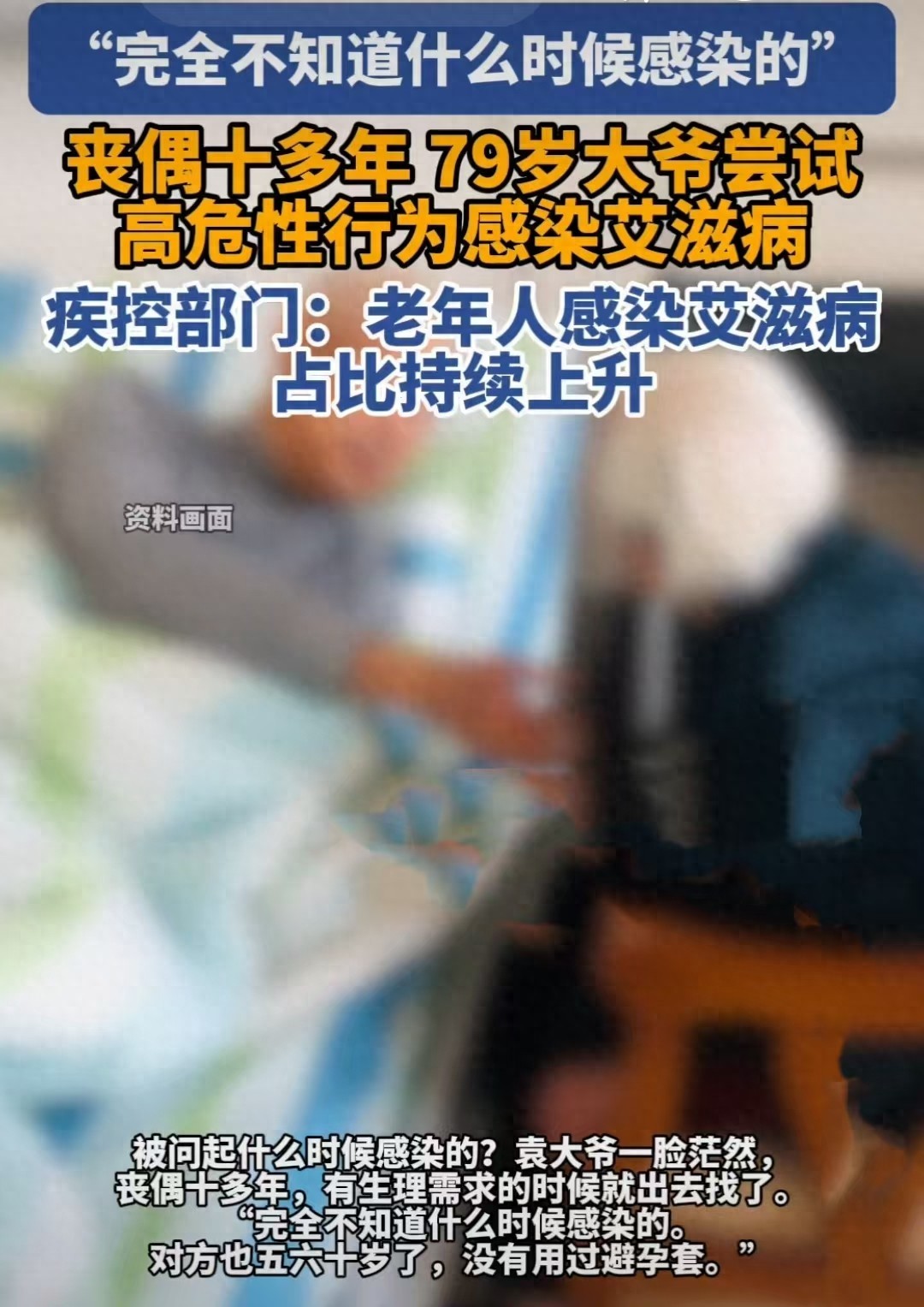 79岁的袁大爷老伴去世后,他就一直没再找伴侣。每当有生理需求的时候,就会去外面找人解决。直到身体出现异样去医院检查,才发现自己感染了艾滋病。当被医生问道发生关系时是否有采取措施,大爷回答的是“她都五六十岁了,又不会怀孕,我还用啥避孕套?”也正是这个疏忽大意,才导致自己不幸感染艾滋病。