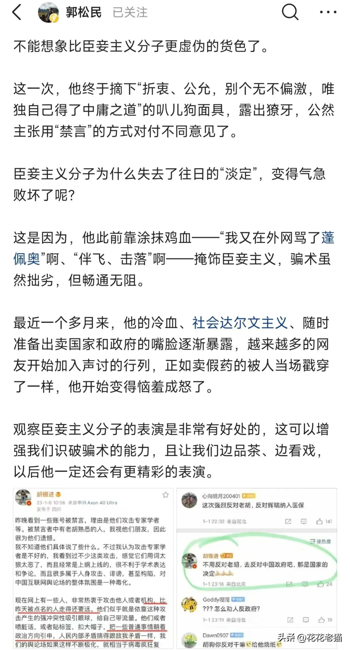 著名学者陈松民对于胡锡进的发文进行批评。郭松民表示:不能想象比臣妾主义分子更虚伪的货色了!他终于摘下“折衷、公允,别个不偏激,唯独自己得了中庸之道”的面具。他的冷血、社会达尔文主义、随时出卖国家和政府嘴脸逐渐暴露。其实郭松民批评的是谁不言而喻。郭松民的言辞犀利让人叹为观止,在微博禁言的风波后,还能一如既往的深刻批评某个大v,要是说他蹭流量,谁也不信,这是要冒着禁言的情况下发文。不知道谁会为流量来断送自己的社交平台。看看司马南的被禁言后,言语还是比较温和的,但是司马南讲的都是事实。