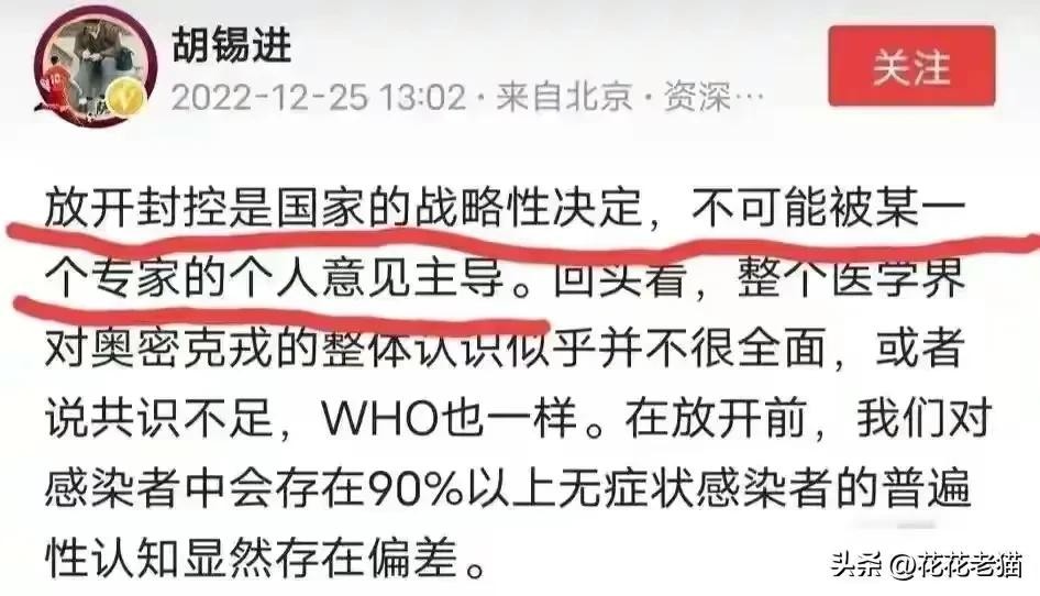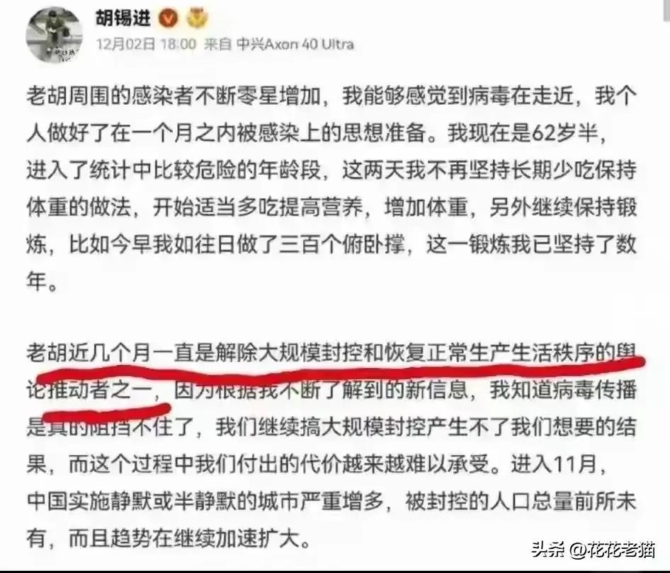 一、网友留言家里80岁老人被邻居感染,万一顶不住怎么办?算谁的。胡锡进回复:老人知道算谁的。看看胡锡进冷血齿冷的言论,甚至向死亡的老百姓伸把手,可能吗?胡锡进是放开舆论推动者,但是只管放开,放开前,老人面临的风险从来没有见过他呼吁过,或者说只想贪功舆论领导者的地位,但是其他方面都不在他考虑范围,唯一呼吁就是要推荐辉瑞口服药,而且几天内连发三篇文章。一个退休,有高工资,高医疗,高人脉朋友圈的人,谁会能同情底层人民的疾苦。