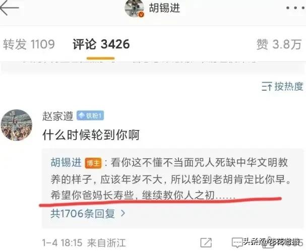 三、激进的网友表示什么时候轮到你。说实话这样的网友说话确实过分,就应该被禁言。但是呢,老胡作为一个有涵养的人回复只限于此次两人而已,可以任意回复完全没错。但是胡锡进回复扯上此网友的爸妈岂不让人过分解读?即使再生气,再愤怒,祸不及家人,言语不能攻击人家家人吧!人家家人也不知道这样的事吧?
