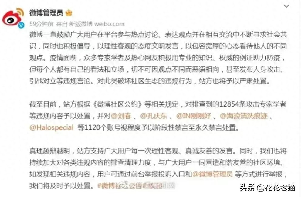最近风波不断,而且还都在点名之列。微博发文公告对于攻击专家学者等违规账号进行禁言。其中不乏凤凰新媒体高级副总裁刘春,北大著名教授孔庆东等等。看来风起了,一些东西不能再摆上台面讨论了,或者讨论可以不能言语攻击。个人认为,的确不能以目的性或者博流量的情况来攻击他人。但是即使一些专家、学者说谎或者引导舆论也不能让别人批评和评论吗?