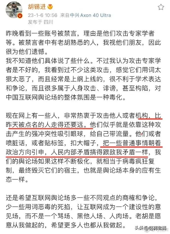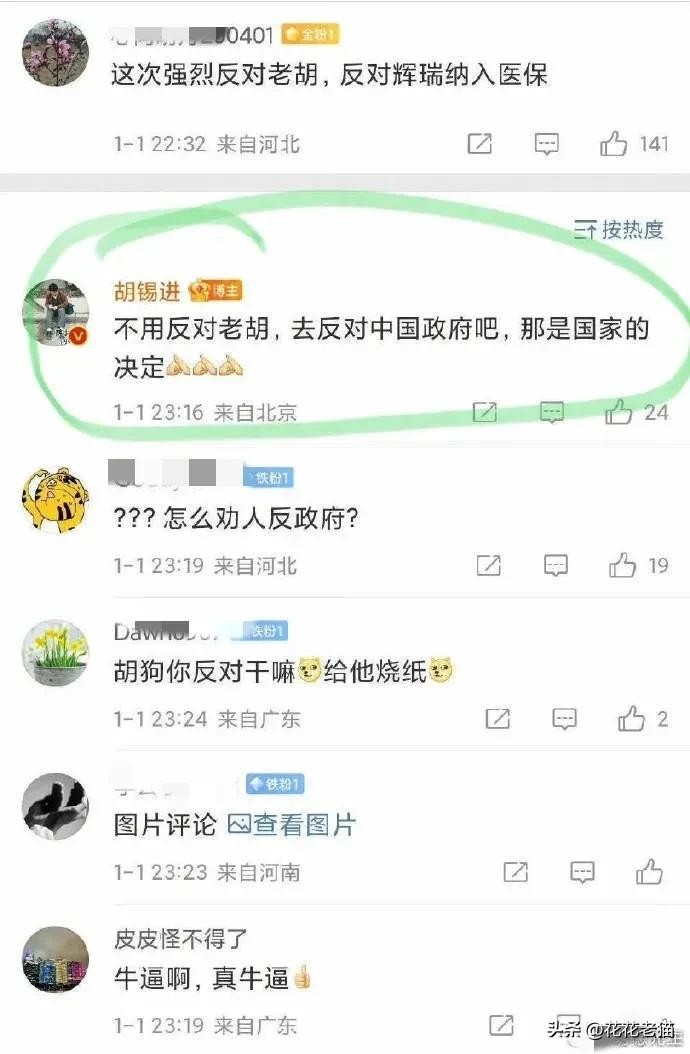 二、胡锡进说不能把言论引向政治层面,但是他做到了吗?自己言语很诚实。两个方面:网友批评胡锡进推动放开舆论,而胡锡进却甩锅给政府,但是这是胡锡进自己说过的自己承认过的。另一方面,网友发文反对老胡反对辉瑞口服药进医保,而胡锡进回复:反对中国政府吧!这些言语是不是引向政治。一个老共产党员,在这样的场合能说出这样的话,真让人想不到,