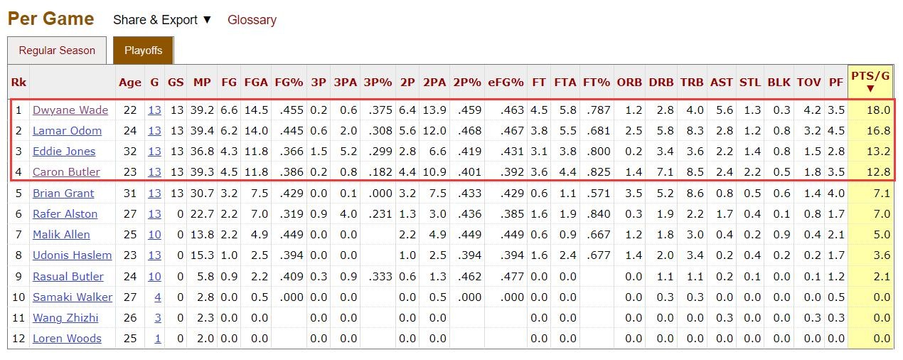 季后赛韦德首秀就绝杀了自己的模板巴郎戴维斯领衔的黄蜂队,体现了他的杀手本能和巨星潜质。虽然本轮打到抢七大战,主要依赖卡隆-巴特勒的23分热火才惊险晋级,但是韦德本轮已经上升到队内二号得分手的位置,场均能拿到15.4分。