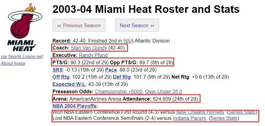 03-04赛季,热火队在开局七连败之后止住颓势,最终收获42胜40负,东区第四的战绩,杀入了季后赛。热火队的进攻效率联盟倒数,但好在场均失分89.7排在联盟第八,而且当年东部较弱,让他们得以突围。由于韦德并不是热门新秀,加上热火队内没有什么知名球星,这让他们的上座率持续下滑,并且没有获得全美直播的机会。