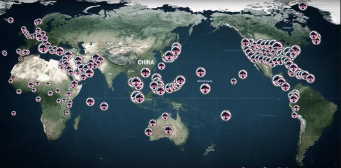 美国的军事存在几乎遍及全球【图1】,美海外军事基地300多个,分布在140多个国家和地区,军人约30万人;本土基地800多个,其中海军基地200多个,空军基地300多个。