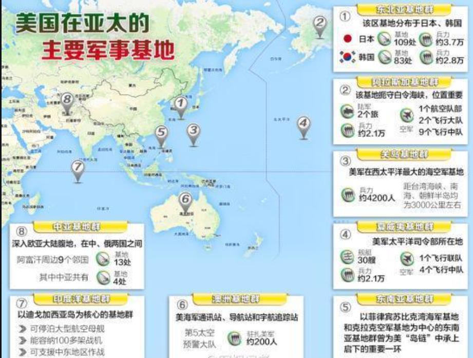 美国在日本横须贺(在东京湾附近)、佐世保(隔朝鲜海峡与韩国相邻)、横田、座间、冲绳岛(隔东海与中国相望)、三泽等地设有军事基地和设施。总的驻军约37000余人,军港可停靠航母在内的大型军舰,空军装备有最先进的五代战机F22、F35等。(监视俄罗斯太平洋舰队、日本、韩国、朝鲜、中国东出太平洋路线等)