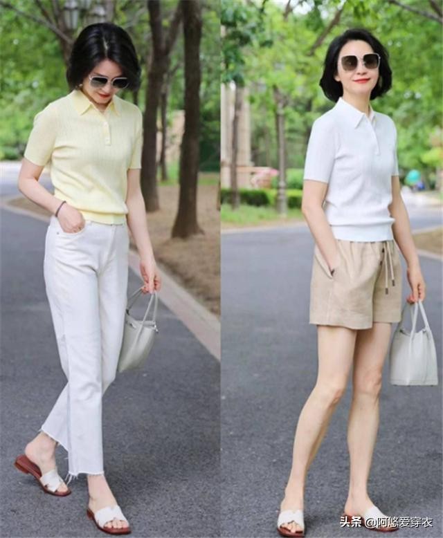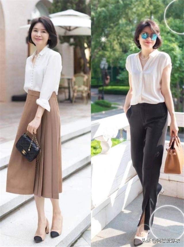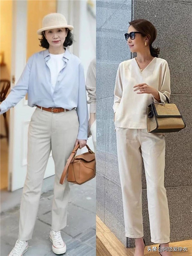 其实对于50岁以后的女性来说,如果是通勤的穿搭,那么就不能穿得过于正实,也不能过于随意,所以这时候你要把握平衡感,既要温柔知性,同时又要干练,像这种简单的polo衫或衬衫穿身上都是很有气质的,搭配上裤装也会延续这种风格,看上去极其成熟稳重,对于上了年纪的女性来说都很容易hold住。