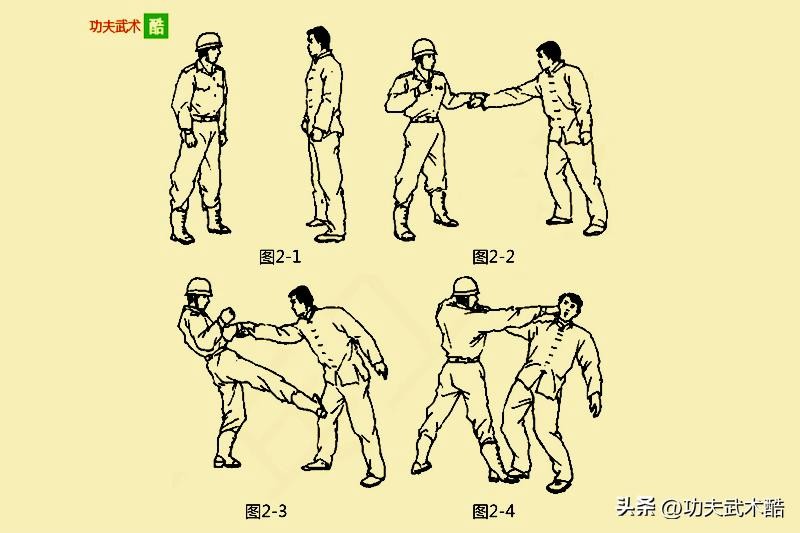 敌我双方相对而立(图2-1)。我方突然上前,用左手抓握住敌方的右手腕上拉(图2-2)。用拉臂破坏敌方重心以迫使敌方右腿向前维持身体平衡,我方趁机用右脚侧蹬敌方右膝关节(图2-3)。紧接着,我方右脚向前落步,左手在将敌方右臂回拉的同时用右直拳猛击敌方的面部(图2-4)。